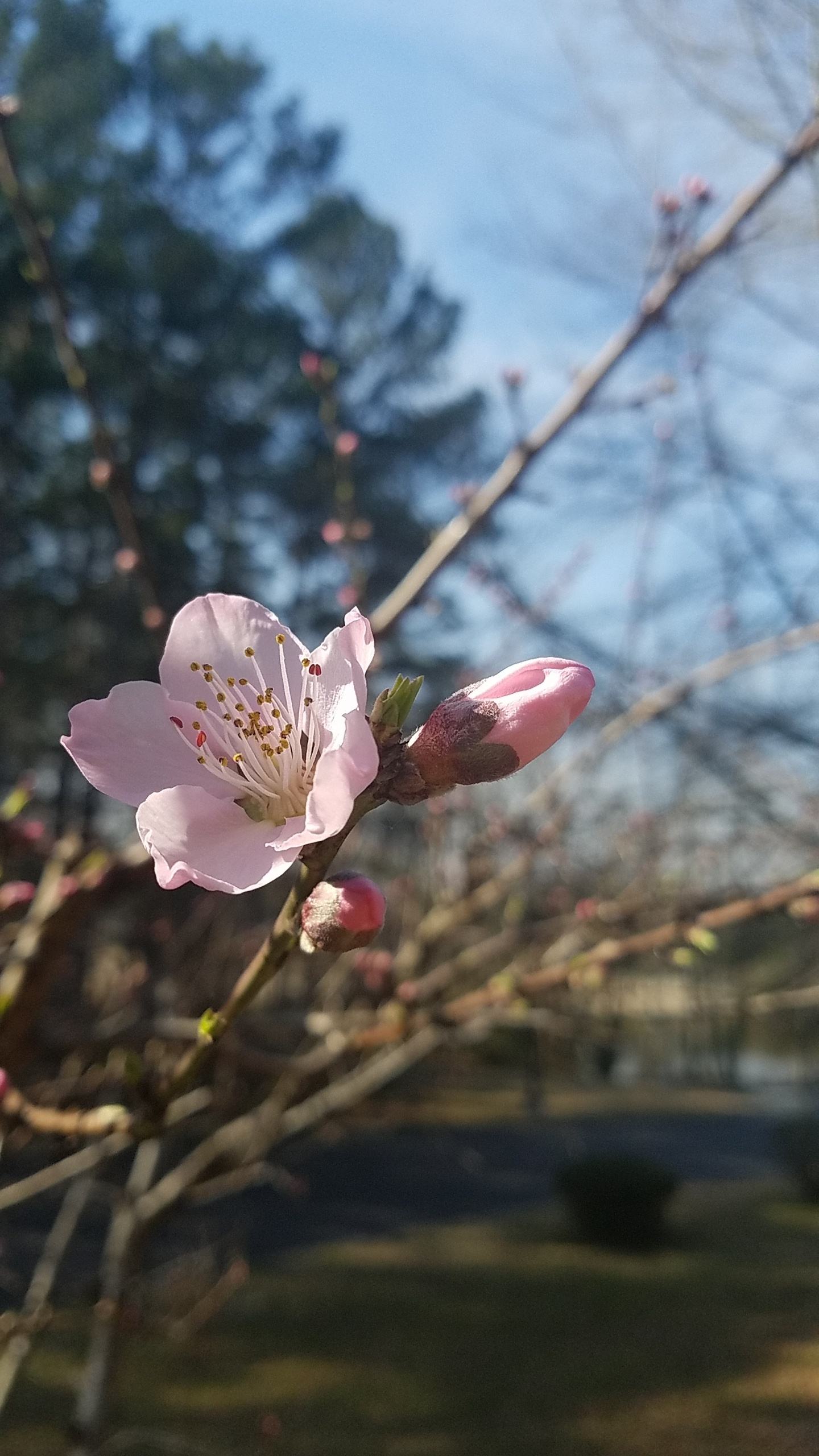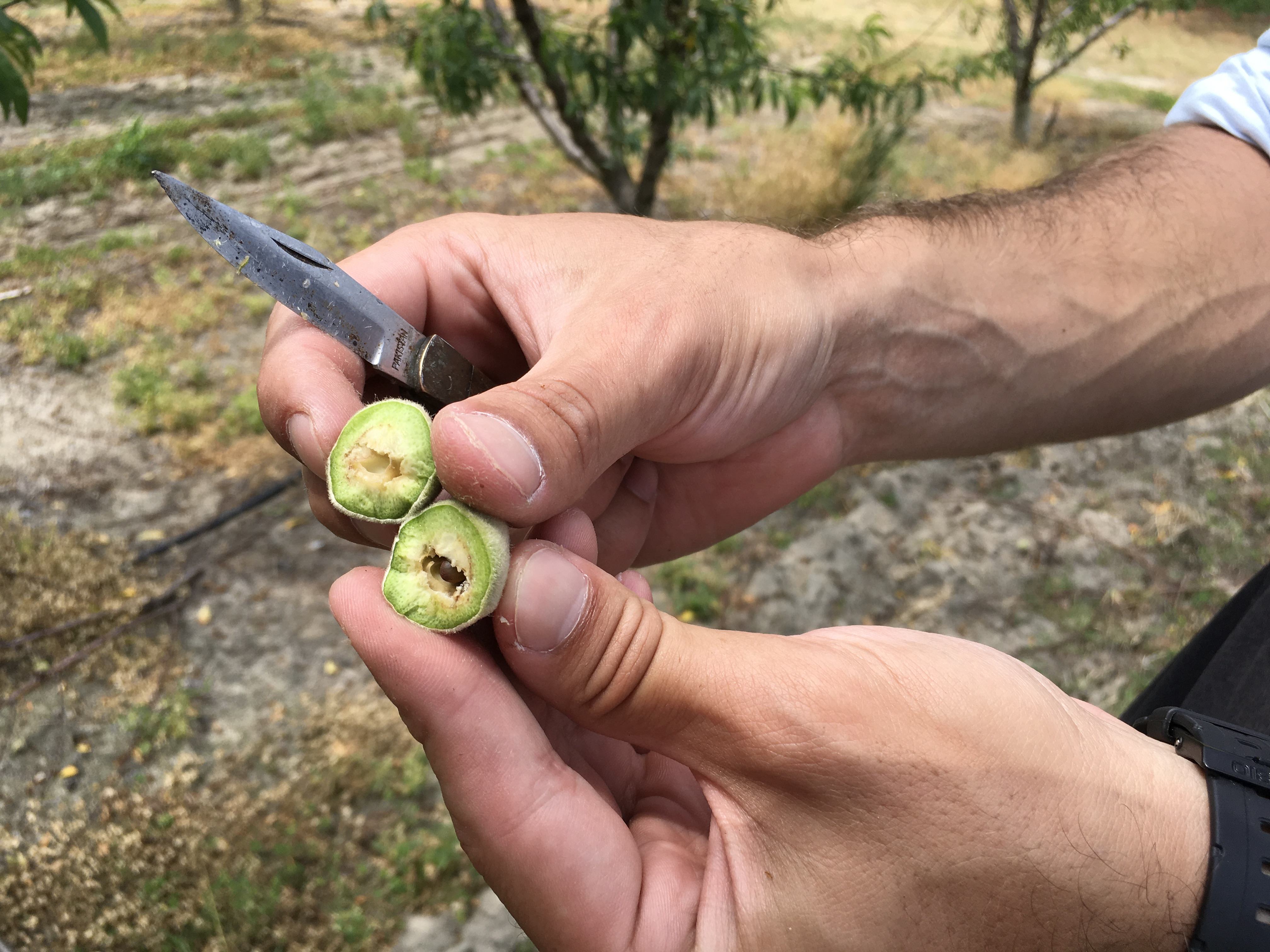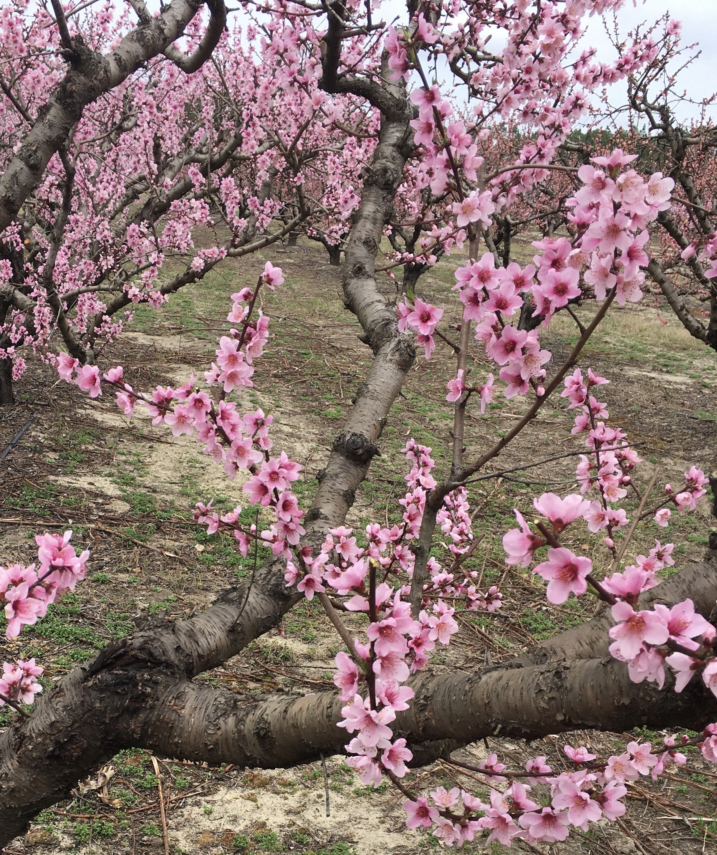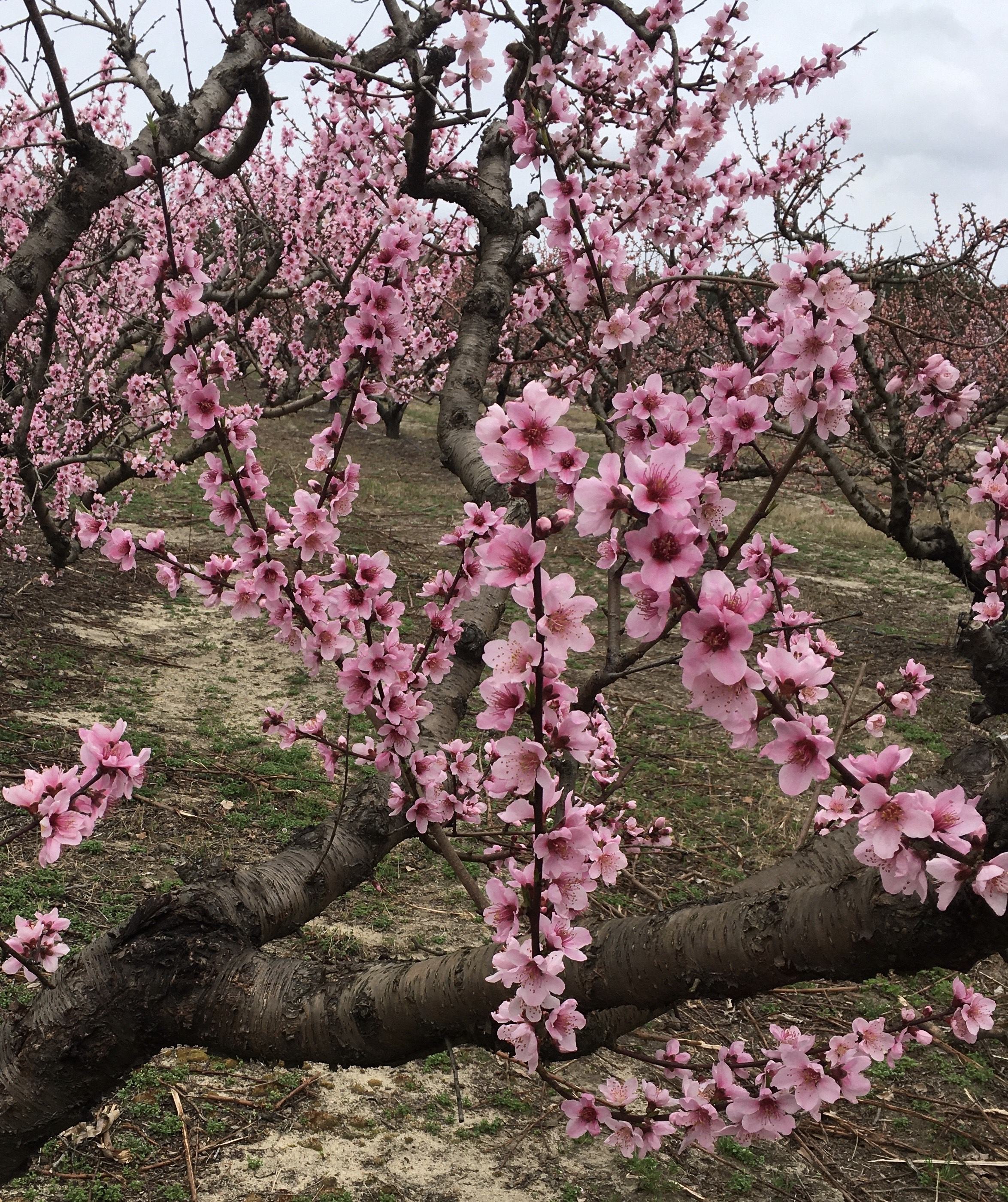 Once your peach tree is in full bloom, you can continue to thin. At this point, there is still a chance of a late freeze, so you'll want to proceed carefully and not remove too many blooms. A late freeze will naturally thin out some of your blooms/fruit. You can tell a freeze damaged fruit from a non freeze damaged fruit by slicing it through the center and checking the color of the pit. However, after the threat of freezing has passed, and you start to see little baby peaches, you'll want to get thinning.